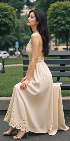 Movements are natural: sitting elegantly on a park bench, legs slightly tilted, one hand casually placed by your side, and the other hand gently supporting your chin.