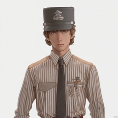 necktie, employee uniform, shoes, belt, suit, uniform,vertical-striped shirt, striped shirt, pinstripe suit, pants, shirt, striped, hat