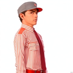 necktie, employee uniform, shoes, belt, suit, uniform,vertical-striped shirt, striped shirt, pinstripe suit, pants, shirt, striped, hat