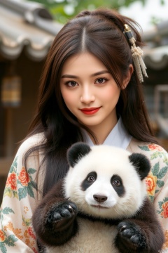 A beautiful girl wearing Hanfu took a photo with a panda as a souvenir! Looking at the camera with a slight smile, a warm scene! High definition 4K, close-up
