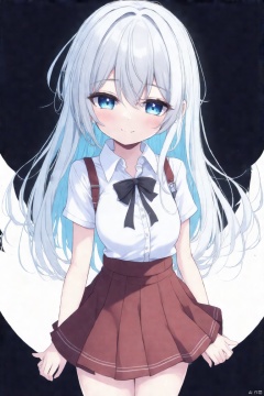 masterpiece,best quality,high quality,(colorful),loli,1girl, long hair, shirt, solo, ribbon, neck ribbon, black background, collared shirt, white shirt, looking at viewer, upper body, hair between eyes, black ribbon, closed mouth, arms at sides, white hair, blue theme, shirt tucked in, skirt, simple background, sketch, light smile, grey eyes, smile, grey hair, straight-on