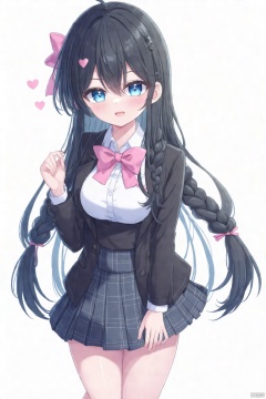 1girl, solo, long hair, looking at viewer, blush, smile, bangs, blue eyes, skirt, shirt, black hair, hair ornament, long sleeves, bow, very long hair, closed mouth, school uniform, jacket, white shirt, braid, pleated skirt, hairclip, collared shirt, virtual youtuber, bowtie, black jacket, plaid, blazer, pink bow, french braid, pink bowtie, tsukino mito,heart-shaped_pupils