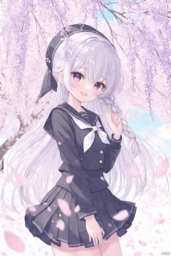 branch, cherry_blossoms, hanami, petals, spring_\(season\), pink_flower, falling_petals, tree, petals_on_liquid, blurry_foreground, graduation, 1girl, tube, plum_blossoms, blurry, solo, depth_of_field, in_tree, school_uniform, long_hair, flower, sanshoku_dango, pleated_skirt, smile, dango, very_long_hair, wisteria, sailor_collar, skirt, shirt, serafuku, day, blue_sky, braid, outdoors, long_sleeves, blurry_background, neckerchief, hand_up, hair_ornament, sitting_in_tree, bangs, picnic, wagashi, hairclip, blush, double_bun, hat ,Masterpiece,Best quality,Extremely detailed