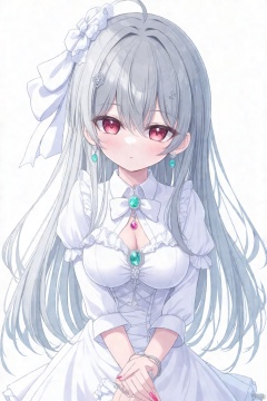 1girl, solo, long hair, breasts, looking at viewer, blush, bangs, shirt, red eyes, long sleeves, white background, dress, bow, hair between eyes, jewelry, medium breasts, closed mouth, white shirt, upper body, hair bow, grey hair, earrings, frills, puffy sleeves, nail polish, white dress, white headwear, hair intakes, own hands together, white bow, gem, interlocked fingers, pink nails, (cute),loli