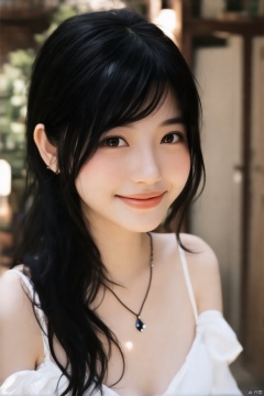 1 asian girl, solo, looking at viewer, smile, long hair, black hair,upper body, necklace, black eyes, lips, realistic