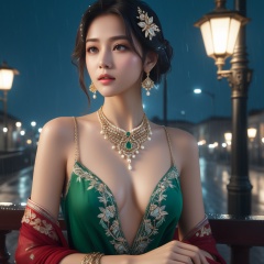 <lora:836-DA-XL-朴正允-绿-B:0.8>, (,1girl, ,best quality, ),, ,ultra detailed 8k cg,            cinematic lighting, cinematic bloom, (( , )),,  , unreal, science fiction,  luxury, jewelry, diamond, pearl, gem, sapphire, ruby, emerald, intricate detail, delicate pattern, charming, alluring, seductive, erotic, enchanting, hair ornament, necklace, earrings, bracelet, armlet,halo,masterpiece, (( , )),,  ,cherry blossoms,(((, night,night sky,lamppost,  ultra high res, (photorealistic:1.4), raw photo, 1girl, , rain, sweat, ,wet, )))(( , ))   (cleavage),,  (sit), ,