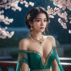 <lora:836-DA-XL-朴正允-绿-B:0.8>, (,1girl, ,best quality, ),, ,ultra detailed 8k cg,            cinematic lighting, cinematic bloom, (( , )),,  , unreal, science fiction,  luxury, jewelry, diamond, pearl, gem, sapphire, ruby, emerald, intricate detail, delicate pattern, charming, alluring, seductive, erotic, enchanting, hair ornament, necklace, earrings, bracelet, armlet,halo,masterpiece, (( , )),,  ,cherry blossoms,(((, night,night sky,,  ultra high res, (photorealistic:1.4), raw photo, 1girl, , rain, sweat, ,wet, )))(( , ))   (cleavage),,  (sit), ,