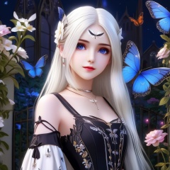 <lora:837-DA-XL-斗罗大陆-千仞雪-幼年:0.8>, (masterpiece),(best quality),night,glowing eyes,gothic,long dress, 1 girl, solo, long white hair, blue eyes, detailed eyes, blink and youll miss it detail,butterfly, flower garden, high quality, floral background, very detailed,off shoulde