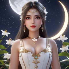 <lora:837-DA-XL-斗罗大陆-千仞雪-幼年:0.8>, (,1girl, ,best quality, ),,  ,,ultra realistic 8k cg, ,masterpiece, (( , )),, realistic,science fiction,mole, ,     ,crescent moon, jasmine \(flower\),     (cleavage),,  (),