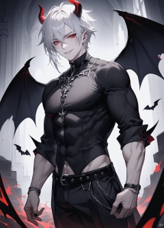 High-quality,1man, demon,solo, red eyes, flirtatious smile, messy white hair, dressed in black clothing, lip piercing, back bat wings, tall and muscular, the background is dark, everything is black and white except for his eyes, relaxed posture, the surrounding environment is dark and mysterious, with lighting focused on his face, highlighting his unique charm.
