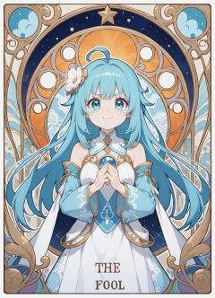 (cowboy shot),(the fool \(tarot\):1.4),(gradient tarot card:1.4),(art nouveau:1.4),frame,tarot,pattern,texture,1girl,solo,(masterpiece, best quality),kawaii,(aqua \(konosuba\):1.2),blue hair,blue eyes,blue shirt,bow,detached sleeves,skirt,thighhighs,bare shoulders,water,fountain,long hair,ahoge,(jitome:1.4),(evil smile:1.2),wedding_dress,bare shoulders,closed mouth,tears,wavy mouth,tearing up,pout,:i,meme,:t,parody,frown,v-shaped eyebrows,crying,sad,crying with eyes open,puffy cheeks,