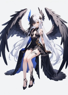 1girl, solo, breasts, looking at viewer, very long hair, bangs, simple background, hair ornament, yellow eyes, gloves, white background, dress, bare shoulders, jewelry, standing, full body, white hair, braid, multicolored hair, small breasts, wings, sleeveless, black gloves, elbow gloves, black footwear, hair over one eye, black dress, high heels, tattoo, feathered wings, single glove, black wings, blue gloves, low wings, asymmetrical clothes, asymmetrical gloves, single elbow glove, leg tattoo, single sleeve, mismatched gloves, uneven gloves,(sitting),