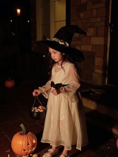 无,A darkened porch,lit only by a flickering jack-o'-lantern's warm glow,sets the eerie scene as a sweet young girl,dressed in a flowing white costume and matching witch hat. Her eyes sparkle with mischief as she holds out a candy-filled cauldron.,