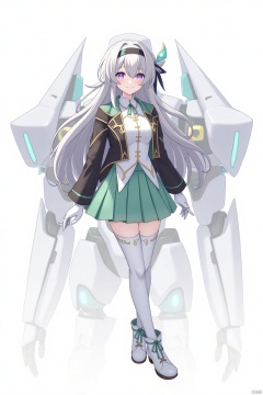 1girl, solo, long hair, breasts, looking at viewer, smile, bangs, blue eyes, skirt, thighhighs, gloves, hair between eyes, medium breasts, closed mouth, purple eyes, jacket, white hair, grey hair, hairband, boots, black jacket, white footwear, black hairband, robot, green skirt