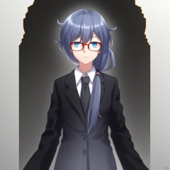 (((arms at side))), glasses,suit,long hair,shirt,necktie,jacket,blue eyes,white shirt,fu hua,white gloves,hair between eyes,black,framed eyewear,long sleeves,low ponytail