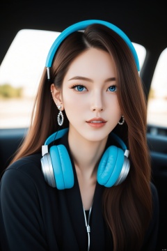 HD photography,depth of field, highly detailed, high contrast, film grain, 1girl, 1girl, solo, long hair, looking at viewer, blue eyes, brown hair, jewelry, upper body, earrings, parted lips, hair over one eye, headphones, piercing, ground vehicle, ear piercing, motor vehicle, headphones around neck