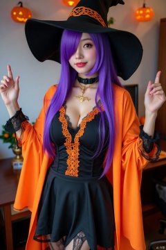 Scores_9, Scores_8, Scores_7, 1 Mature, asian Female,Enchanting Appearance, Smile, Pink Lips, Black Dog Collar, Exquisite Gold Necklace, Halloween Costume, Big Wizard Hat, Black Cloth Skirt, Black Shirt with Orange Lace, Orange Robe, Black Lace Straightening Stockings, Enchanting Appearance, Bright Purple Hair, Very Long Hair, Hair Covering One Eye, Red Eyes, Big Breasts, Office Decorated with Halloween Decorations, Perfect Body, Perfect Anatomy, Pornographic Anatomy, Perfect Arms, Perfect Fingers, Perfect Legs, Environmental Light, Shadows