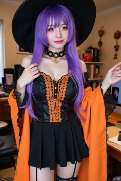 Scores_9, Scores_8, Scores_7, 1 Mature, asian Female,Enchanting Appearance, Smile, Pink Lips, Black Dog Collar, Exquisite Gold Necklace, Halloween Costume, Big Wizard Hat, Black Cloth Skirt, Black Shirt with Orange Lace, Orange Robe, Black Lace Straightening Stockings, Enchanting Appearance, Bright Purple Hair, Very Long Hair, Hair Covering One Eye, Red Eyes, Big Breasts, Office Decorated with Halloween Decorations, Perfect Body, Perfect Anatomy, Pornographic Anatomy, Perfect Arms, Perfect Fingers, Perfect Legs, Environmental Light, Shadows