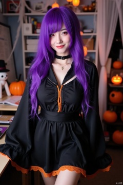 A bewitching mature asian woman dons an enchanting Halloween costume. She wears a black cloth skirt and matching shirt with orange lace trim. A bright purple wig cascades down her back, partially covering one eye. Her face gleams with a radiant smile, pink lips, and red eyes that seem to glow in the dimly lit office environment. A delicate gold necklace adorns her neck, complemented by a black dog collar. The space around her is transformed into a spooky lair, complete with cobwebs, jack-o'-lanterns, and other eerie decorations. Her very long hair flows like a river of darkness, framing her statuesque figure, which boasts perfect anatomy and a tantalizing big-breasted physique