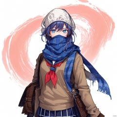 (((arms at side))), scarf,skirt,bag,school bag,school uniform,blue skirt,shoulder bag,((serafuku, neckerchief,(white earmuffs),fu hua,blue_eyes,hair_between_eyes,pleated skirt,scarf over mouth