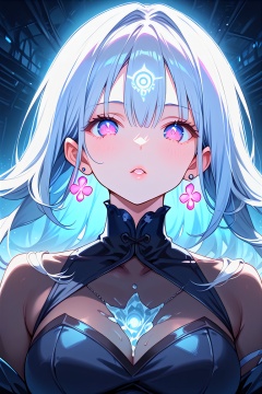 Close-up of an ethereal, pale-skinned young woman with long, straight, ice-blue hair and bangs covering her forehead. Her eyes are glowing magenta with dark, thin tears streaming down her cheeks, creating a ghostly, unsettling effect. She wears a high-neck, intricate, gothic-style black garment adorned with subtle chains, giving her a mysterious, dark allure. The background is an intense, radial pattern of magenta and deep purple rays emanating from behind her, adding a surreal and hypnotic feel. Her expression is blank, with slightly parted lips, enhancing the haunting, almost otherworldly aura.