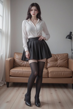 A beautiful woman,Big breasts,Black silk and long legs,Bend down in front of you,Smile at you,High heels,Short shirts, Hip skirt,School uniform,Black stockings,Ultra-low wide-angle lens,