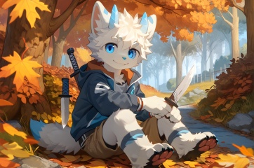 solo, looking at viewer, smile, blue eyes, 1boy, animal ears, sitting, weapon, white hair, male focus, outdoors, horns, shorts, tree, leaf, knife, furry, autumn leaves, furry male, autumn