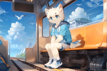 solo, smile, short hair, blue eyes, 1boy, animal ears, sitting, closed mouth, white hair, short sleeves, male focus, outdoors, sky, shorts, day, socks, artist name, cloud, hood, blue sky, hoodie, bird, ocean, ground vehicle, furry, white fur, train interior, seagull,source_furry,anthro
