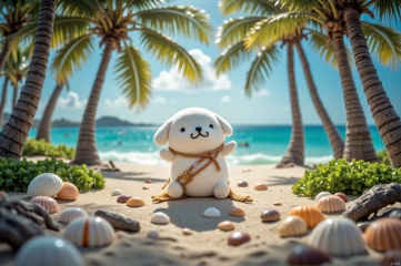 A serene beach scene unfolds before us: soft focus captures the gentle rustle of coconut trees swaying in the ocean breeze. Amidst the palm fronds, a purin kneels, surrounded by an array of shimmering shells, their delicate forms glistening in the warm sunlight that filters through the lush foliage.,