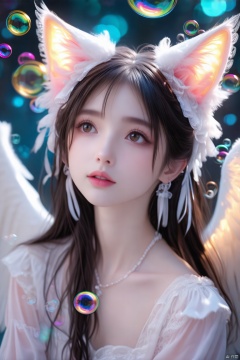 Super high resolution, angel, poet, cat ears, highlights, look up, colorful bubbles, Monet style, broken dreams, long hair, gothic style, lolita style, Magazine cover