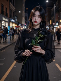 1girl, black hair, dress, black flower, flower, solo, long hair, black rose, black dress, rose, blurry, holding, blurry background, holding flower, outdoors, night, red lips, jewelry, mole, long sleeves, street, makeup, human_lips