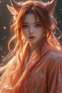 A masterpiece with best quality, ultra-detailed photography featuring an 橘红色狐狸精with a perfect face and 狐狸面纱under soft, natural light. She wears a robe made of starlight and 透亮的液体, reflecting 霓虹灯光and shimmering with detailed pupils. The scene is framed with a color difference, capturing her alluring presence in HD, 32k resolution. The background showcases 紫薇星辰with super clean, 8k details, creating an official art, extremely detailed CG8k wallpaper. The composition is a full-body shot, highlighting the intricate details of the 橘红色tones and starlight robe, exuding an aura of mystique. She has a 魅惑的表情, 潮红cheeks, and a playful tongue.