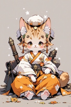 Cute kitten,An animated image of a cat sitting on the ground. The cat is wearing a white and orange outfit with white flowers on it. There is a black bag behind the cat. There are white stars in the sky above the cat's head. The background is a grayish gray color.