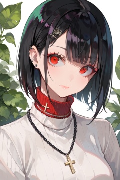 score_9, score_8_up, score_7_up, score_6_up, prsnl3, 1girl, solo, short hair, black hair, jewelry, looking at viewer, necklace, cross, portrait, bangs, red eyes, closed mouth, turtleneck, blurry background, cross necklace, lips, piercing, blurry, bob cut, eyelashes,designzmix,source_anime