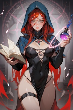 score_9, score_8_up, score_7_up, score_6_up, score_5_up, score_4_up, sorceress, casting thunder magic spells, blue hood, medium breasts, colorful eyes, freckles, red hair, magic circle, thigh strap, petite, 1girl, delicate and smooth skin, blush, perfect body, thighs, large breasts, highly detailed, glossy lips, looking at viewer, tomes in background, magic book, ritual, vials, potion, designzmix,source_anime
