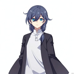 (((arms at side))), long hair,(((jacket))),white shirt,blue eyes,hair between eyes,hair flaps,fu hua,collared shirt,white sailor collar,short sleeves