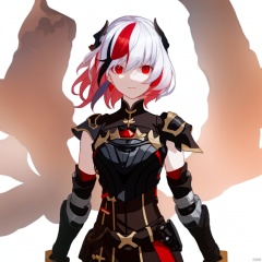(((arms at side))),pink hair,white hair,shoulder armor,hair ornament,streaked hair,red hair,multicolored hair,red eyes,fu_hua,hair_between_eyes, fu_hua,multicolored_hair,white_hair,red_eyes,pink_hair