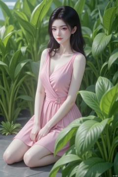 1girl,Green plants,,Pink dress,black hair,realistic,bare shoulders,long hair,(8k, RAW photo, best quality, masterpiece:1.2),(realistic, photo-realistic:1.37),photon mapping,professional lighting,radiosity,Looking at you with a smile,Kneel on the ground