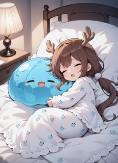 a chibi girl, sleeping with closed eyes, open mouth with slobber,silly face, she has long brown hairs, low twintails, little antlers on head, wearing white fluffy pyjamas, sleeping with hugging a huge slime, covered with a soft quilt together, delicate details, dim indoors atmosphere with soft lamp lights. dynamic angle,