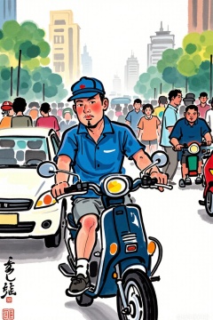 New ink,blush, short hair, shirt, black hair, 1boy, hat, male focus, outdoors, multiple boys, shorts, bag, uniform, facial hair, blue shirt, ground vehicle, motor vehicle, walking, car, motorcycle, bicycle, crowd, employee uniform, people,<lora:models/1382/ed8ffe6b.safetensors:1:1>