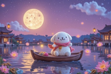 Felt style,Pink Sky,a cute cartoon purin in a chinese wooden boat on the lake, with a giant glowing moon on the boat. Lotus flowers and golden Osmanthus flowers around the lake,chinese buildings and clouds in the background.Playful character design, 3D Cartoon style, miniature scene ,8k, CG,best quality,HDR,UHD,camera uses 35mm f/2.0 wide-angle lens, uses 35mm f/2.0 wide-angle lens,oil painting,OByouhua