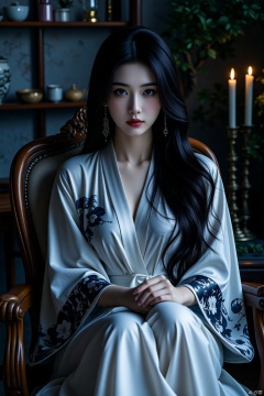 A curvaceous female ghost, wearing a sexy ink robe, is in a dark study. The robe is light, and the dark orchid pattern flickers between the clothes, like the incarnation of a ghost. She sat casually on the sandalwood chair, with a delicate face, deep facial features, dark and charming eyes, and slightly opened red lips, with a mysterious aura. The black hair fell down like a waterfall, emitting a faint light.