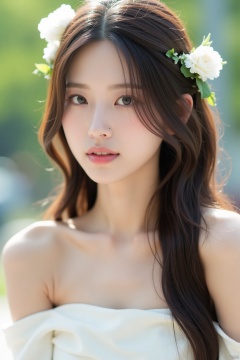 1girl, solo, long hair, looking at viewer, brown hair, hair ornament, dress, bare shoulders, brown eyes, collarbone, upper body, flower, parted lips, teeth, hair flower, off shoulder, white dress, blurry, lips, blurry background, sunlight, white flower, realistic, nose, head wreath