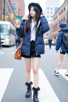 1girl, solo, long hair, shirt, black hair, hat, holding, standing, jacket, full body, white shirt, boots, outdoors, shoes, shorts, day, socks, bag, black footwear, cup, fur trim, short shorts, blue jacket, ground vehicle, building, holding cup, motor vehicle, blue headwear, city, car, road, street, crosswalk, sidewalk