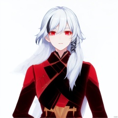 fur trim, jewelry,leather,fur collar,long hair,bandages,white hair, black hair,red eyes,red rope,red legwear,fu hua,hakama,armor,black footwear,high heel boots,jacket,dress,toeless legwear,arm wrap,sarashi,high heels,gradient hair,long sleeves,multicolored hair,braid,gloves,pants,earrings,1girl, bangs, closed mouth, expressionless, hair between eyes, hair ornament, long hair
