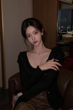 1girl, solo, breasts, looking at viewer, short hair, brown hair, shirt, black hair, long sleeves, cleavage, brown eyes, jewelry, sitting, earrings, parted lips, indoors, lips, black shirt, crossed arms, watch, realistic, wristwatch, blinds,,A young and beautiful Asian girl,Polaroid camera style