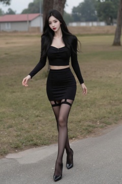 1girl, solo, long hair, breasts, skirt, shirt, black hair, hair ornament, thighhighs, long sleeves, navel, standing, full body, outdoors, midriff, black thighhighs, black skirt, black footwear, high heels, black shirt, makeup, garter straps, lipstick, pencil skirt, walking, red lips,,A young and beautiful Asian girl,black pantyhose