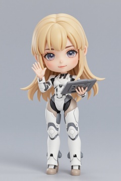 1girl. 3D. chibi, White mecha, mechanical joints, futuristic, blonde, long hair, gray background, smiling, waving gesture, holding a giant drawing tablet brush in his hand,