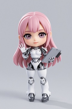 1girl. 3D. chibi, White mecha, mechanical joints, futuristic, pink_hair, long hair, gray background, smiling, waving gesture, holding a giant drawing tablet brush in his hand,