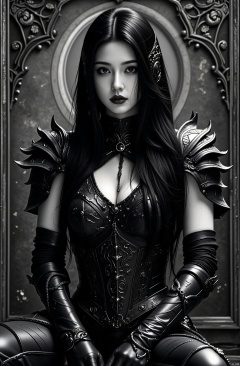(Masterpiece:1.1), (Best Quality:1.1), (Gorgeous:1.1), (Monochrome:1.3), (Black and White:1.3), Rest, (Horror:1.0), (Esoteric:1.1), ( alone:1.4), (dynamic angle:1.0), (cowboy shot:1.0), (lady:1.1), (very muscular toned girl:1.25), ([Strong upper body: 1.25), (Narrow hips: 1.0), Long hair, (Gothic intricate vampire armor: 1.25), ((Full body front view)), (Gloves: 1.0), ( Shoulder armor: 1.1) , ((Tarot style frame:1.25)), (Shining Red Veins:1.25)
